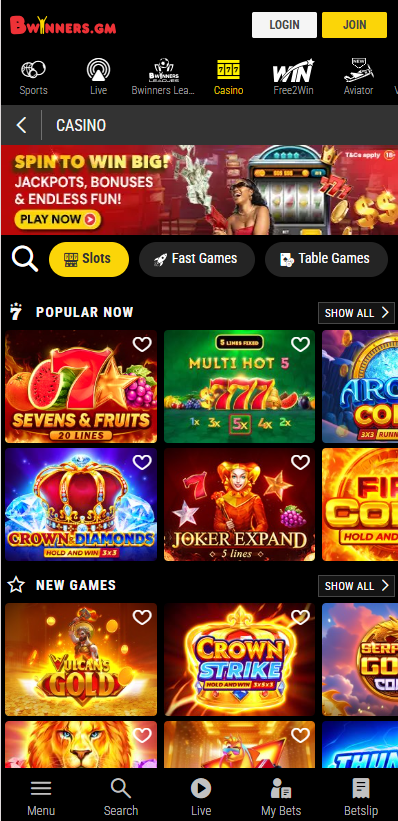 Bwinners.gm features a wide selection of online casino games, including popular slots, classic table games such as roulette and blackjack, and immersive live casino options. Games are optimized for mobile devices, ensuring smooth performance even on lower bandwidth connections.